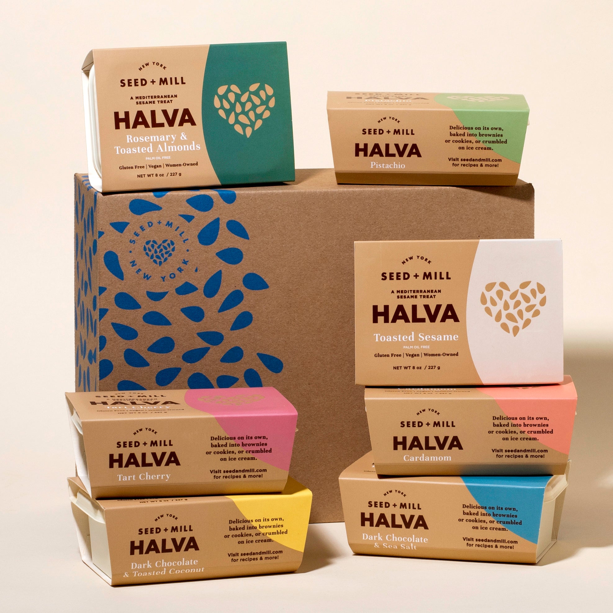 This gift set includes 6 beautifully packaged 8oz boxes of 5 of our best selling halva flavors: Pistachio, Sea Salt Dark Chocolate, Toasted Coconut Chocolate, Cardamom, Tart Cherry, Rosemary Almond and Toasted Sesame.
