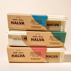 This Halva Trio includes 3 beautifully packaged 8oz boxes of our best selling halva flavors: Sea Salt Dark Chocolate, Rosemary Almond and Tart Cherry!